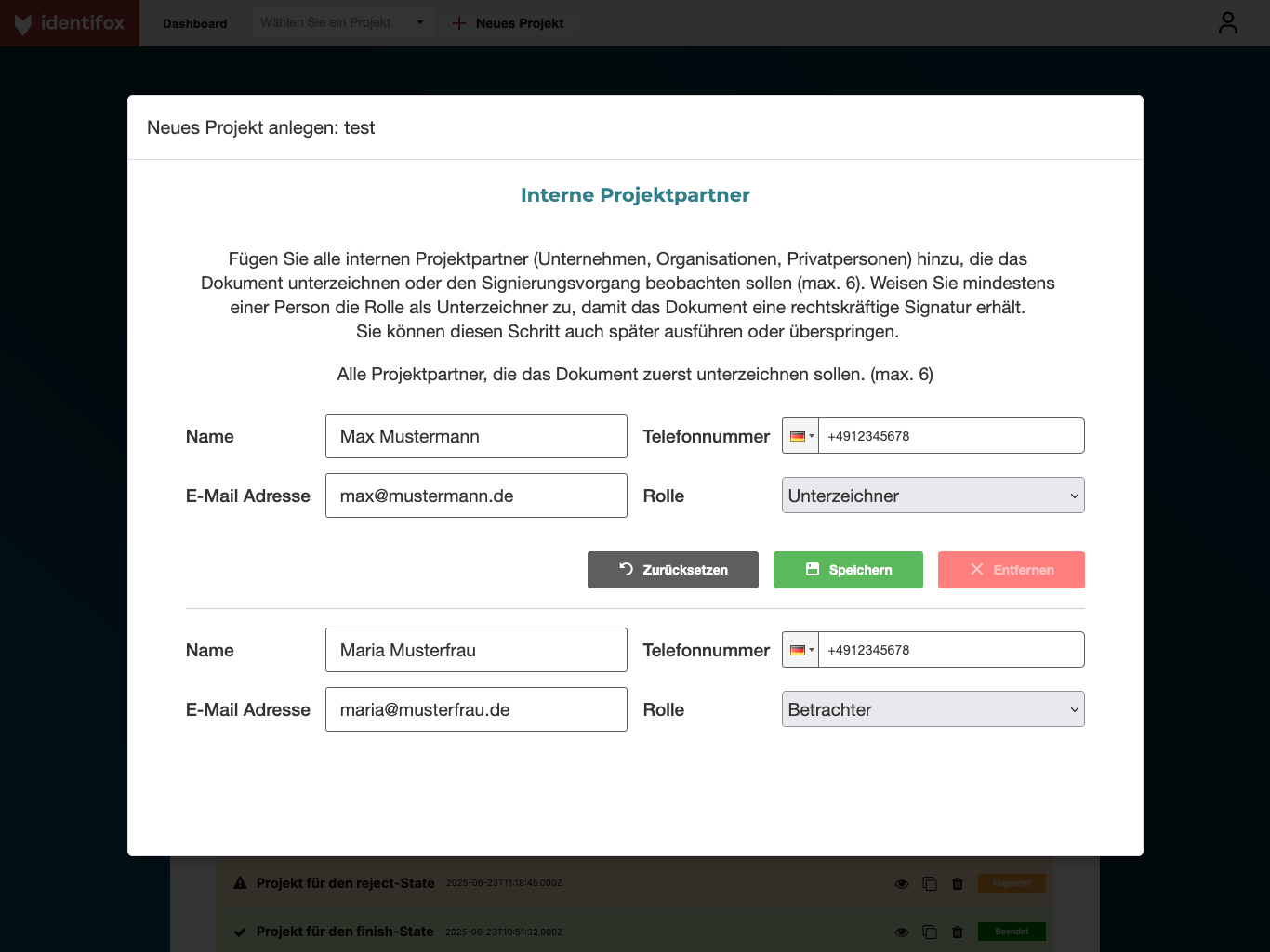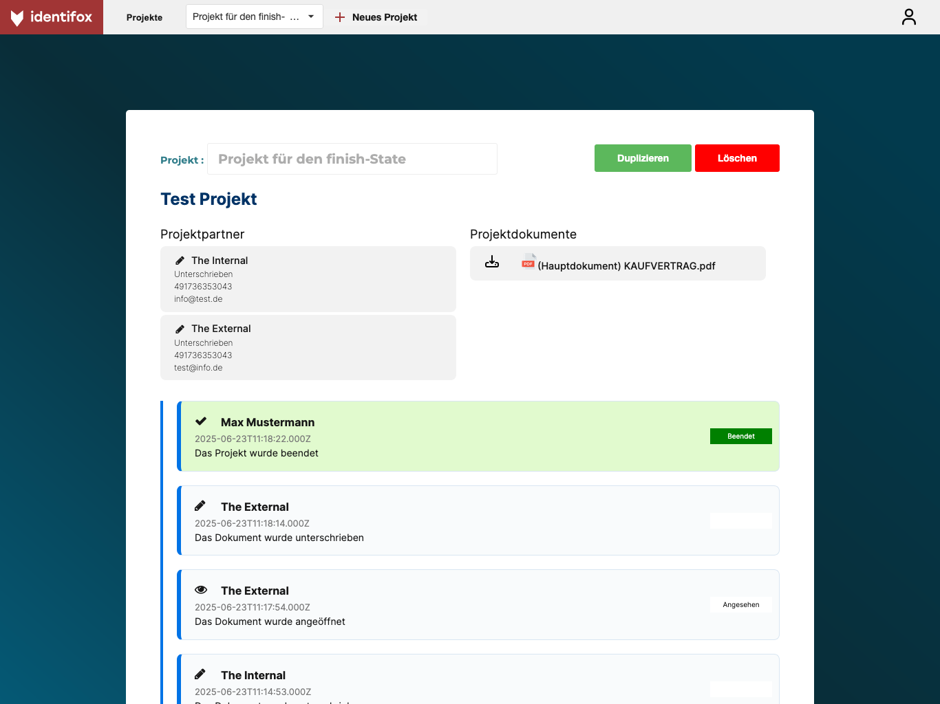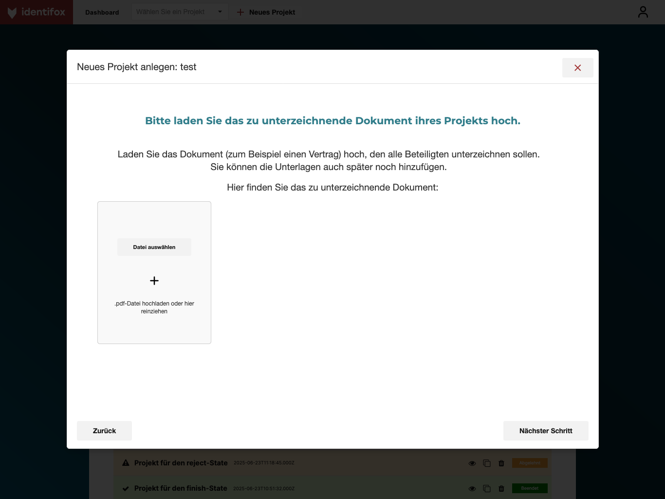 Fix per Telefonnummer registrieren oder einloggen und schon können Sie ihr erstes Projekt in Identifox anlegen. Oder ihr zweites und drittes. Arbeiten Sie gleichzeitig an verschiedenen Dokumenten und lassen Sie sich so viele Unterlagen signieren, wie Sie wollen.